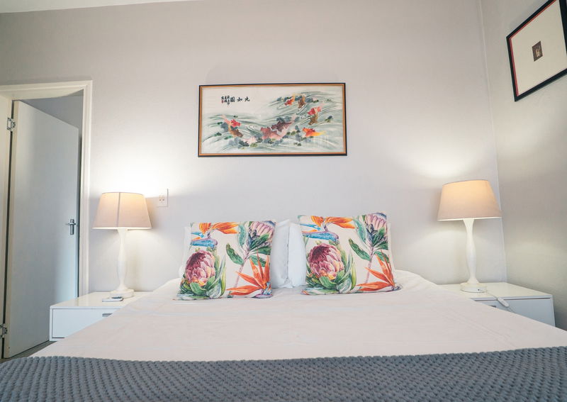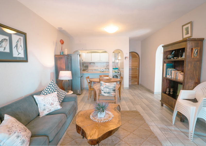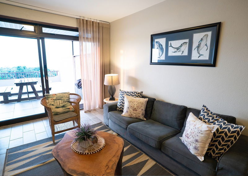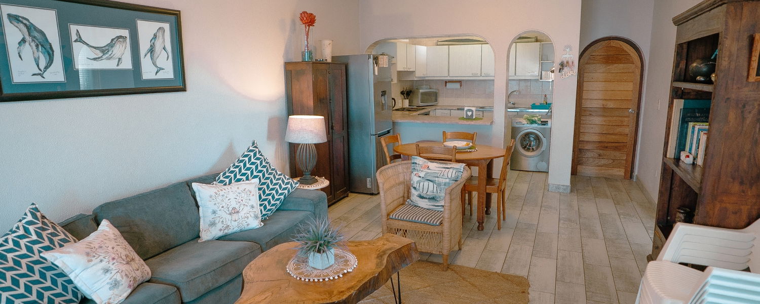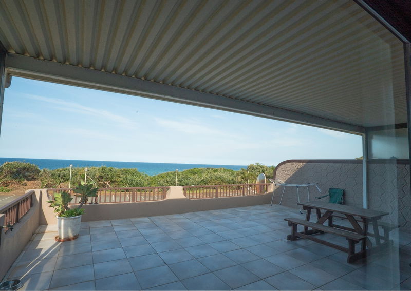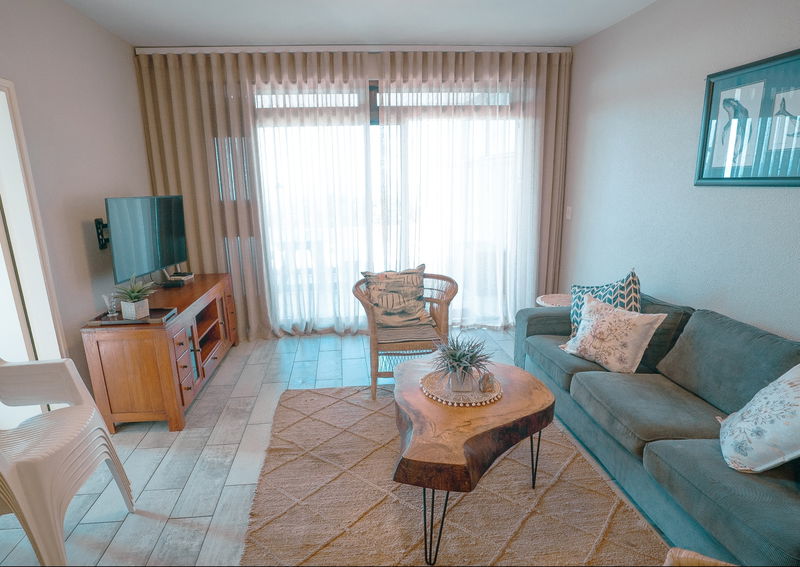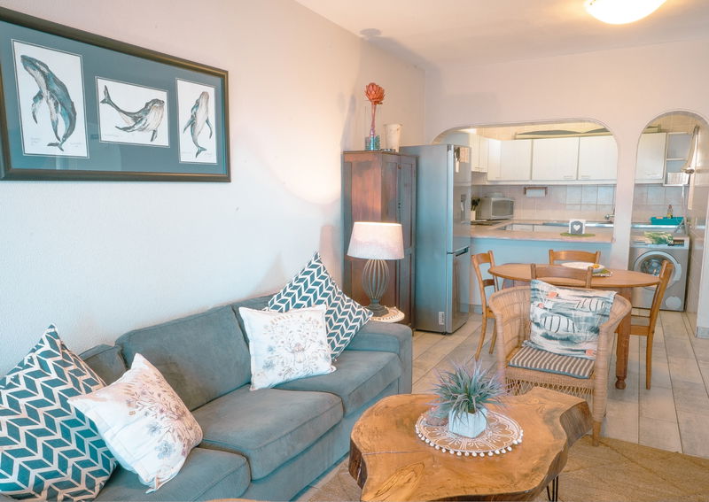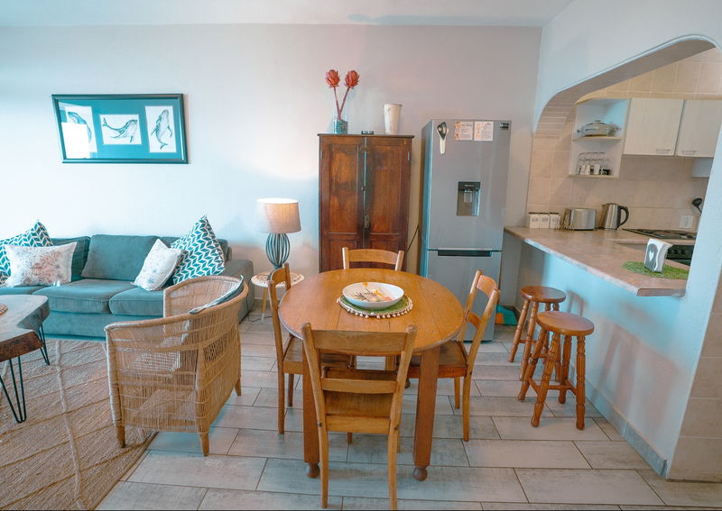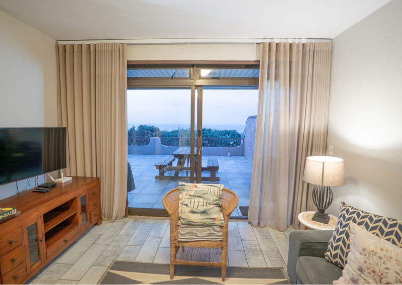 The apartment includes a queen bedroom and a double bedroom with shared bathroom. The open-plan living area connects to a full kitchen and dining space. Sliding doors lead onto the furnished veranda with sea views, perfect for relaxed meals or braais. Linen and bath towels are provided.
