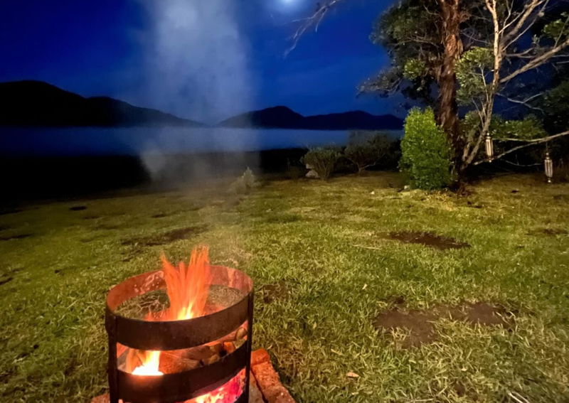 The bus opens onto a wooden deck overlooking the lake, with sun loungers and a braai area for outdoor cooking. Guests can relax under the trees, enjoy evening bonfires, or make use of the canoes and paddle boat available on the farm.