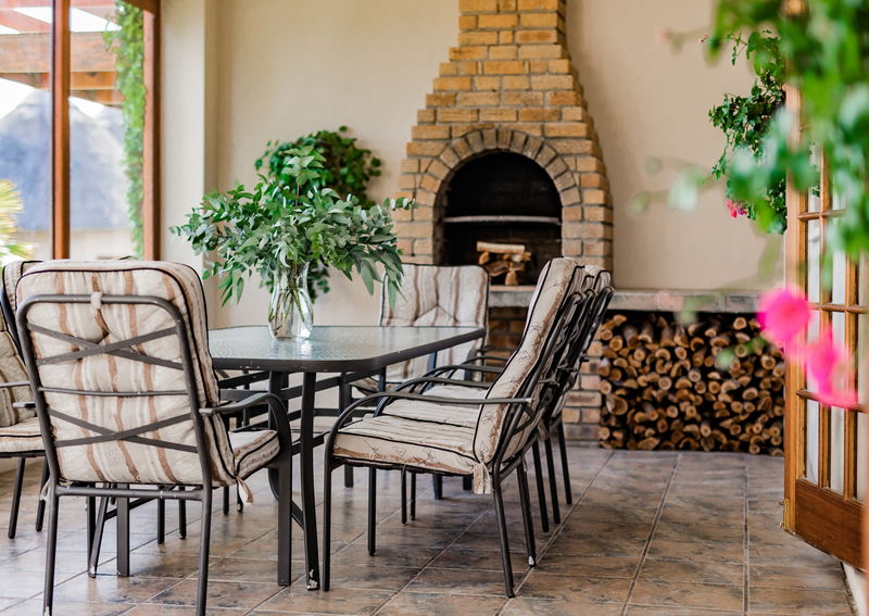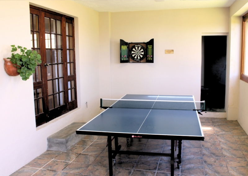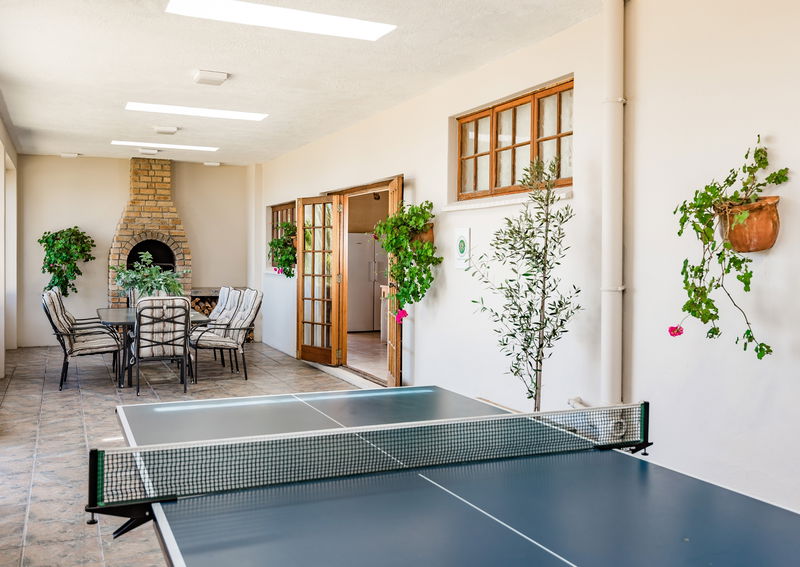 The multi-storey house offers five bedrooms furnished with king-size or twin beds, sleeping up to ten guests comfortably. There are three bathrooms, a fully equipped kitchen, a dining area, and a spacious lounge with a TV and fireplace. The enclosed patio includes an outdoor dining table, built-in braai, and table tennis area — perfect for relaxed evenings.