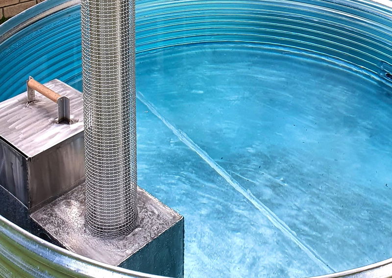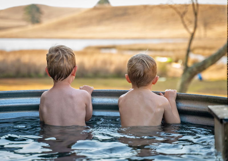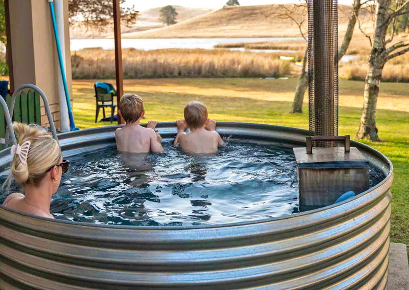 - Outdoor: Wood-fired hot tub (optional), dam access