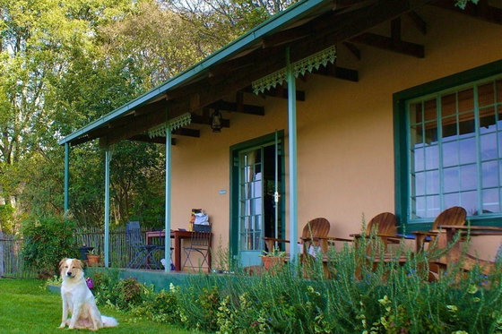 The cottage accommodates 2–4 humans, with a king-size bedroom (convertible to twins) and two single sleeper couches in the living area. Large French doors open onto a wide covered veranda, creating a relaxed indoor–outdoor flow overlooking the garden and surrounding bush.