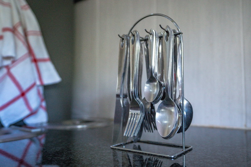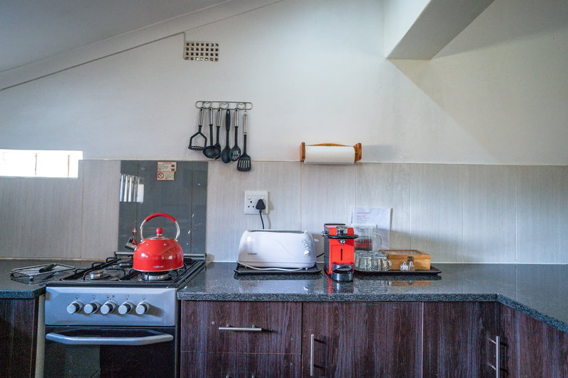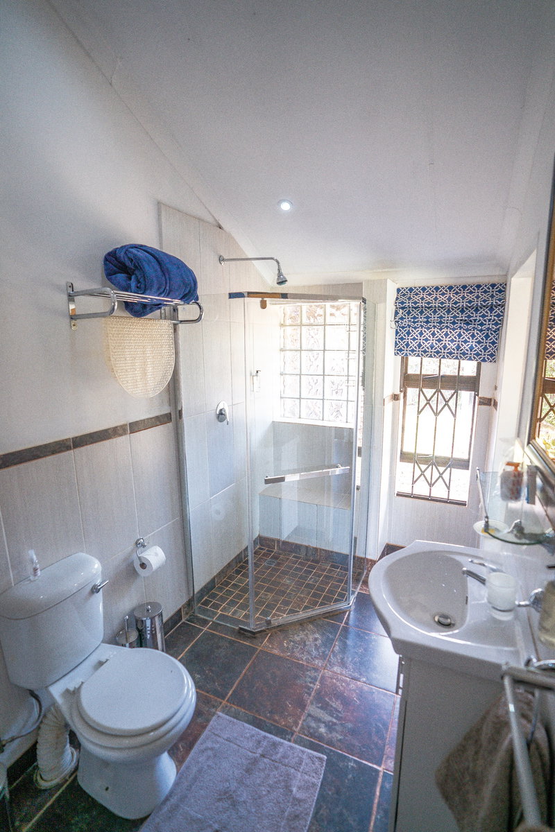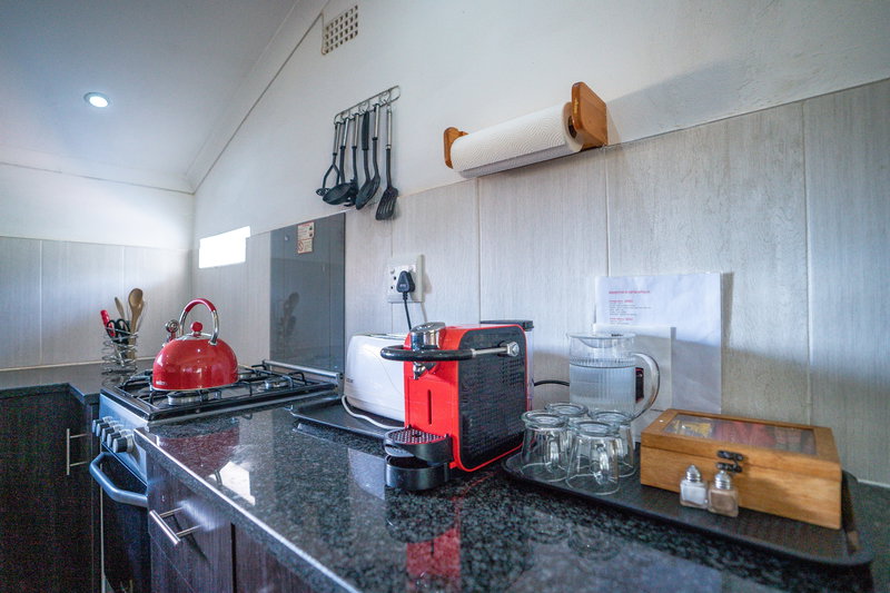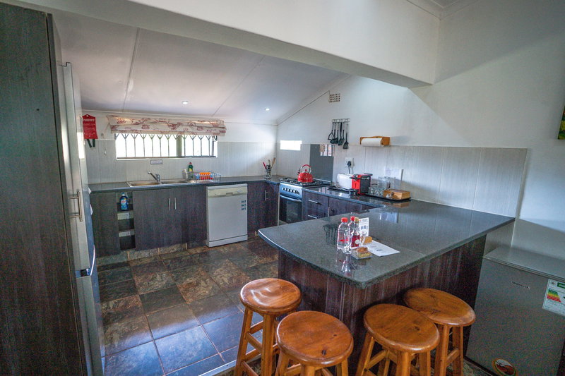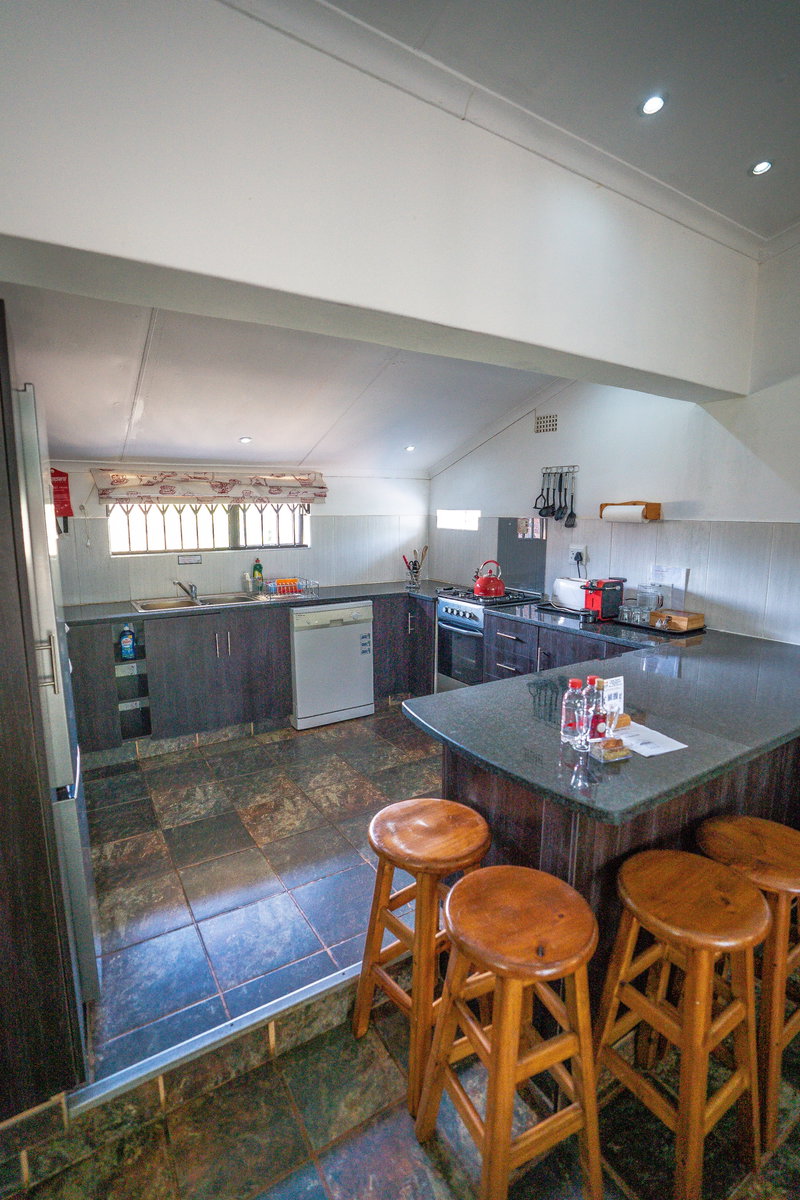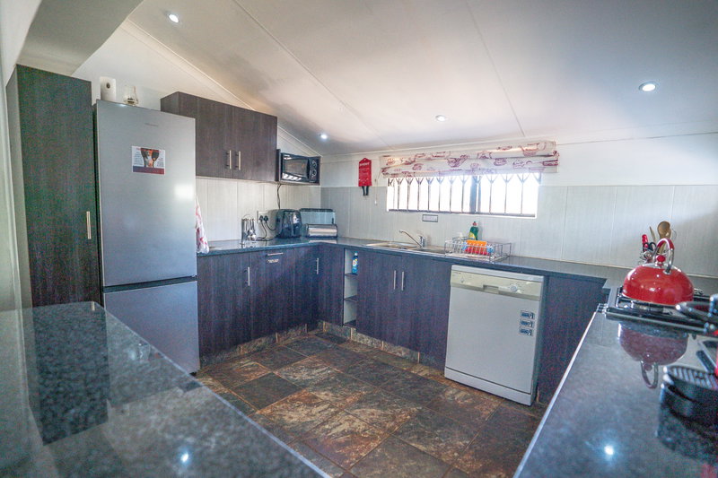 The house is fully off-grid, powered by a solar system, with a solar geyser providing hot water. The kitchen is fully equipped and includes a gas stove and oven, along with a fridge, microwave, dishwasher, and air fryer.