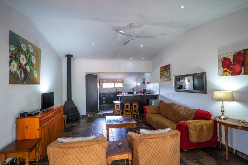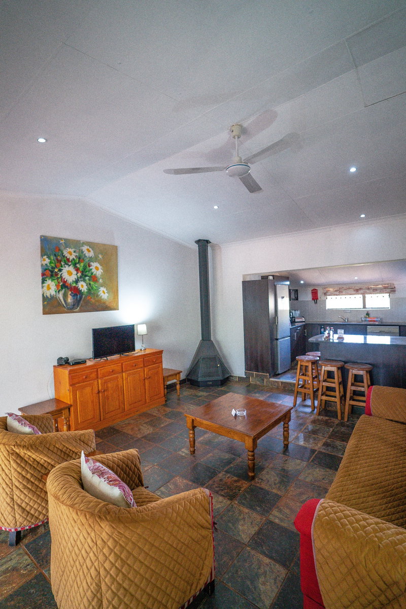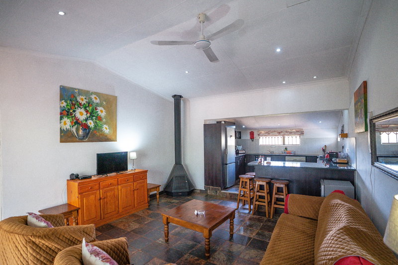 The open-plan living space includes a comfortable lounge, TV with DStv, and an indoor fireplace.