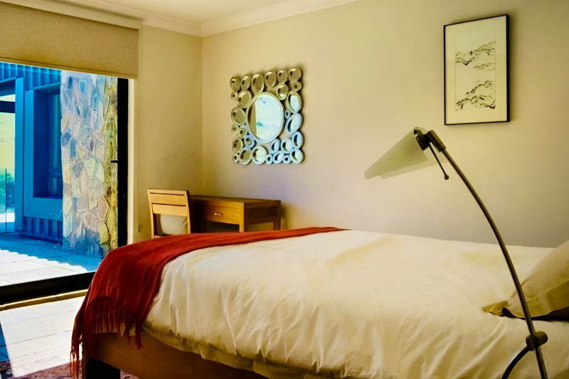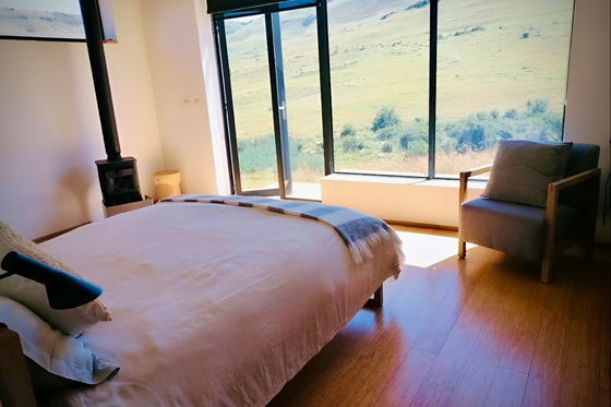 The house includes four bedrooms, all with views over the gorge and surrounding landscape. Two queen bedrooms are en-suite, while a third queen bedroom and a twin bedroom share a full bathroom. One queen bedroom is slightly separate from the main house and is fully self-contained, with its own bathroom and fireplace.