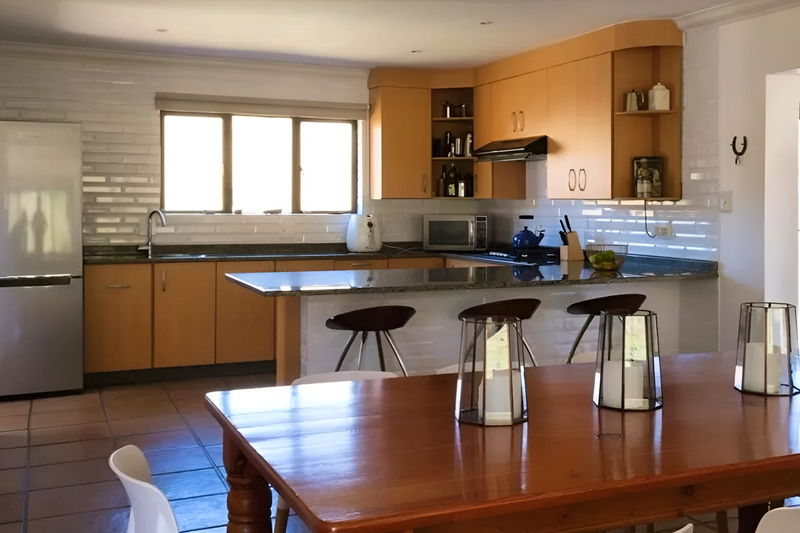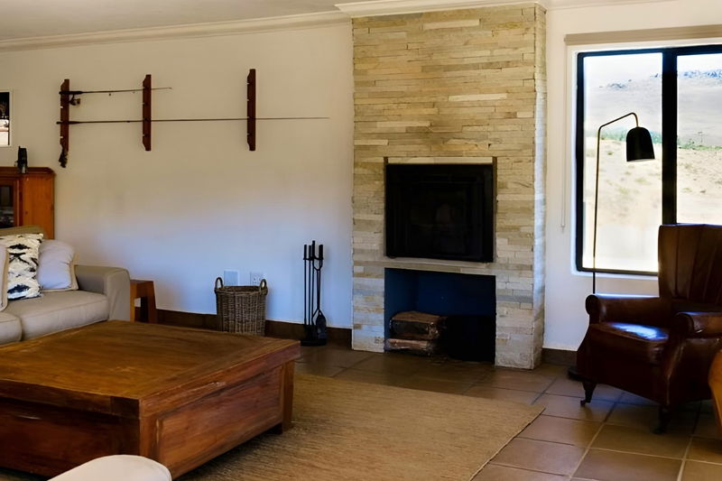 The kitchen is fully equipped for self-catering and includes a 6-plate gas stove, electric oven, pressure cooker, coffee machine, fridge, dishwasher, and washing machine. The dining area seats ten guests, and the lounge includes a fireplace and comfortable seating. Linen and bath towels are provided.