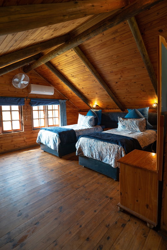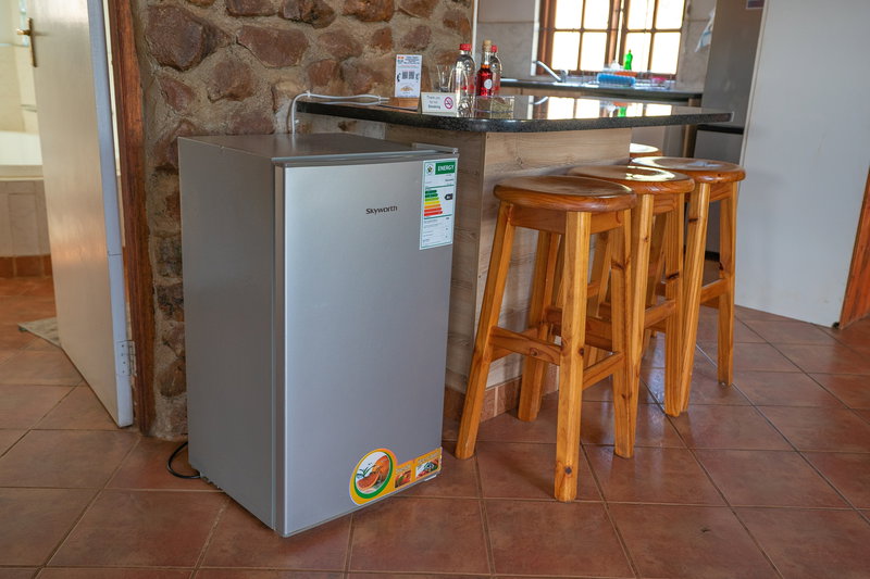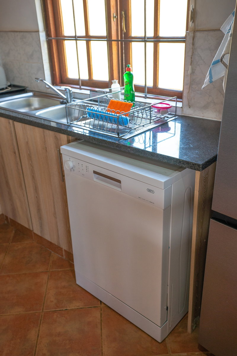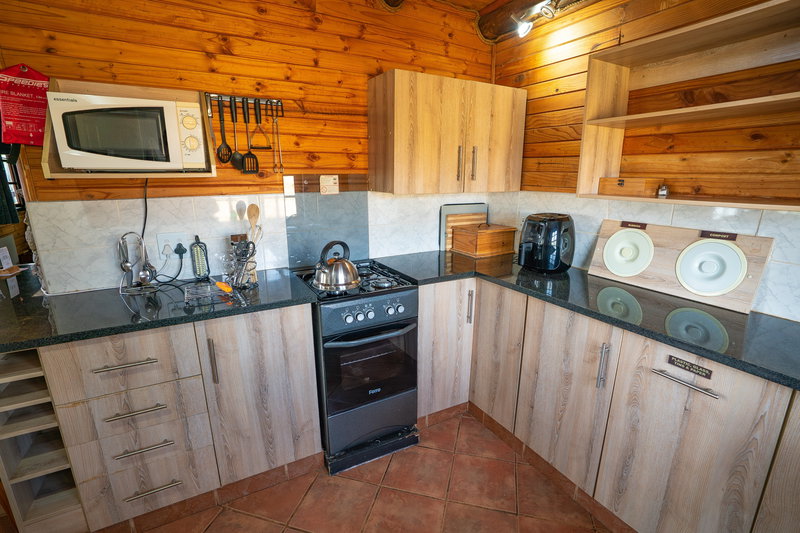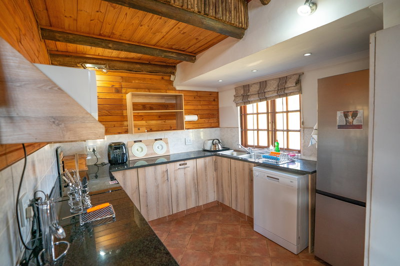 The cottage is fully off-grid, powered by a solar system, with a solar geyser providing hot water. The kitchen is fully equipped and includes a gas stove and oven, along with a fridge, microwave, dishwasher, and air fryer.