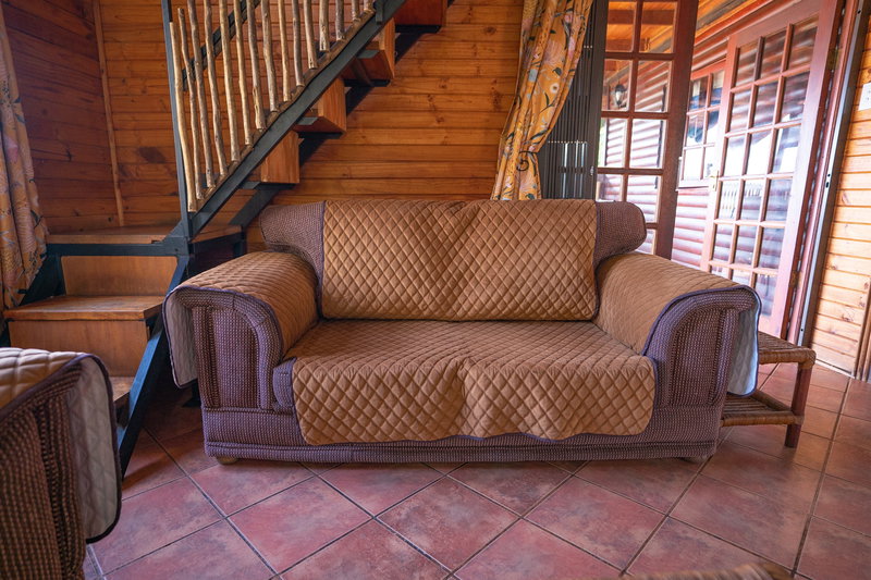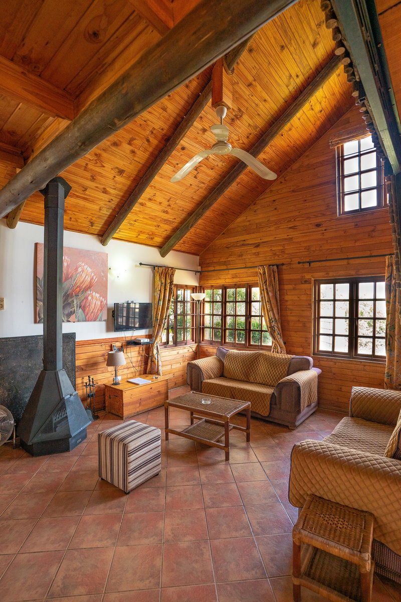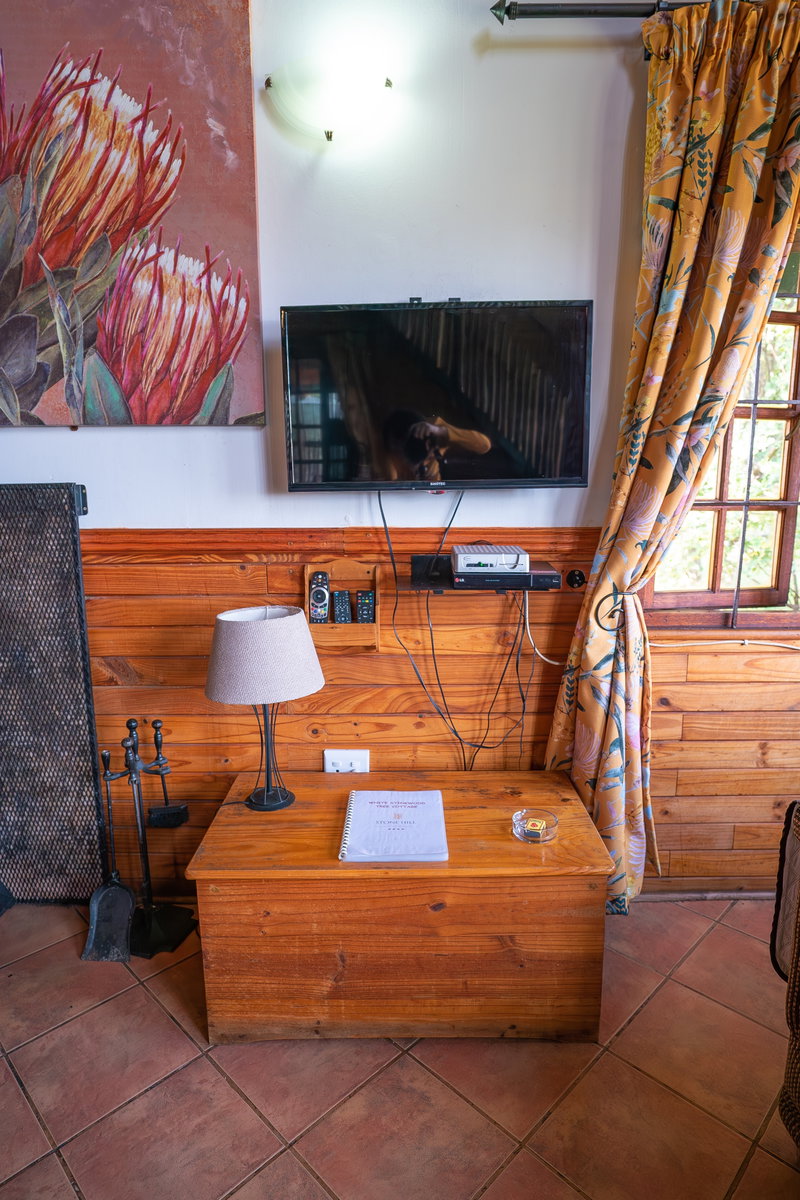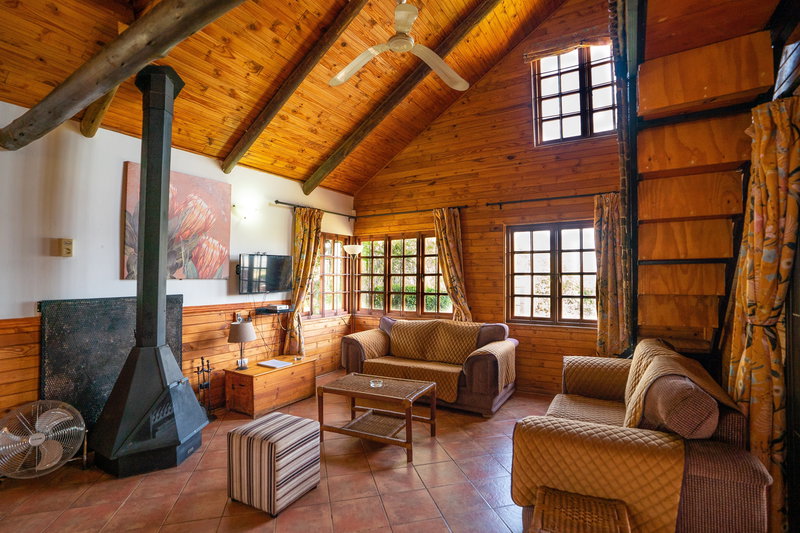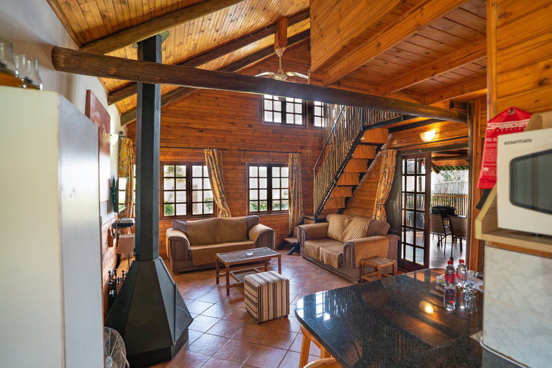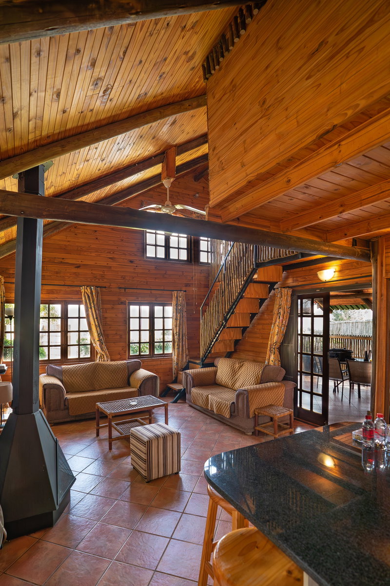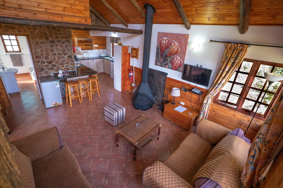 The open-plan living area includes a comfortable lounge, TV with DStv, and an indoor fireplace for cooler evenings.