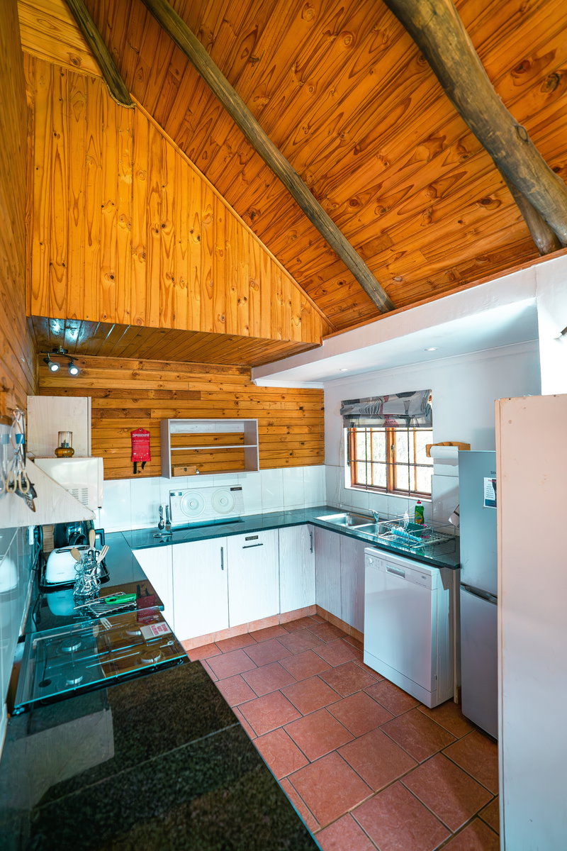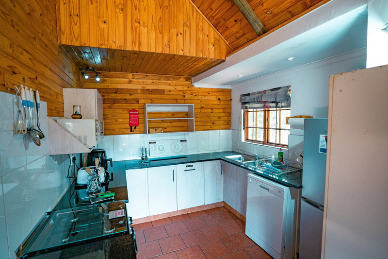 The cottage is fully off-grid, powered by a solar farm, with a solar geyser providing hot water. The kitchen is fully equipped and includes a gas stove and oven, along with a fridge-freezer, microwave, dishwasher, and air fryer.