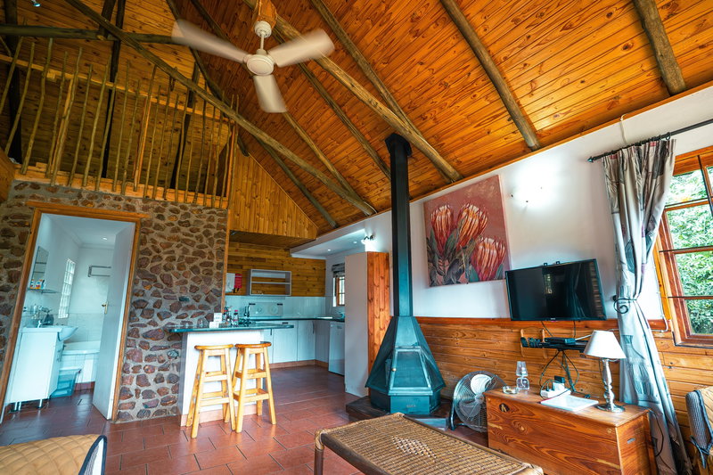 The open-plan living space includes a comfortable lounge, TV with DStv, and an indoor fireplace for colder evenings.